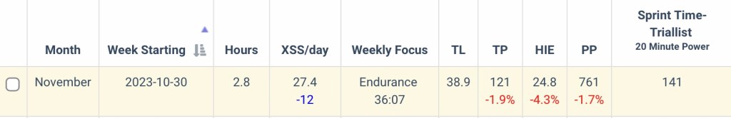 As for progress, TL is definitely is off the chart but LTP is not at 59. It is up 4 points from previous 2 weeks. Although FTP is down, but not to be worry. I’ll take BT Test on mid December to check my numbers again.